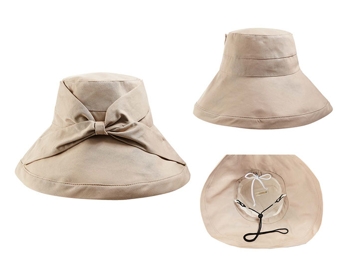 抗UV蝴蝶結純棉透氣純色可折防風大帽簷防曬遮陽帽 杏色
